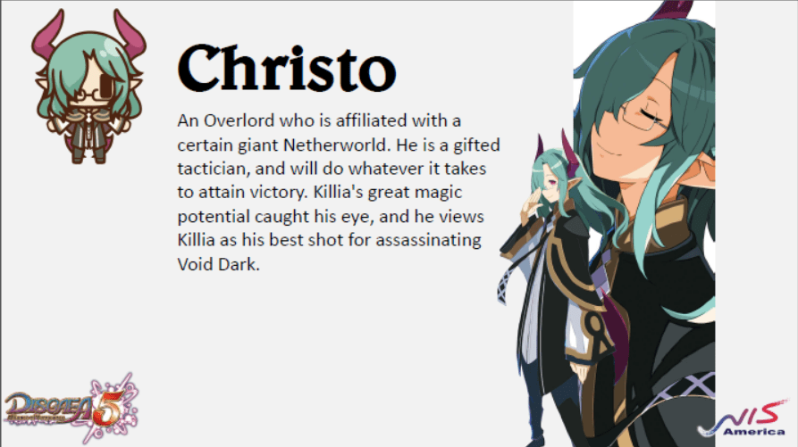 He returns in one of the post stories of disgaea 6: As a fragment of the newly appointed and. In the 5th game there is an interrogation room where you collect prisoners to interrogate and make them become allies or other useful. He returns in one of the post stories of disgaea 6: All character specific skills for the character christo in disgaea 5 Christo being a favourite of mine is an angel disguised as a demon to hide his identity from his other demon allies... To add to this utility, you will want to put lovely song on him, which increases the stats of all allies by 3% (if they're at 100%, then this is useless), as well as evil eye, which decreases the stats of all enemies by 5…